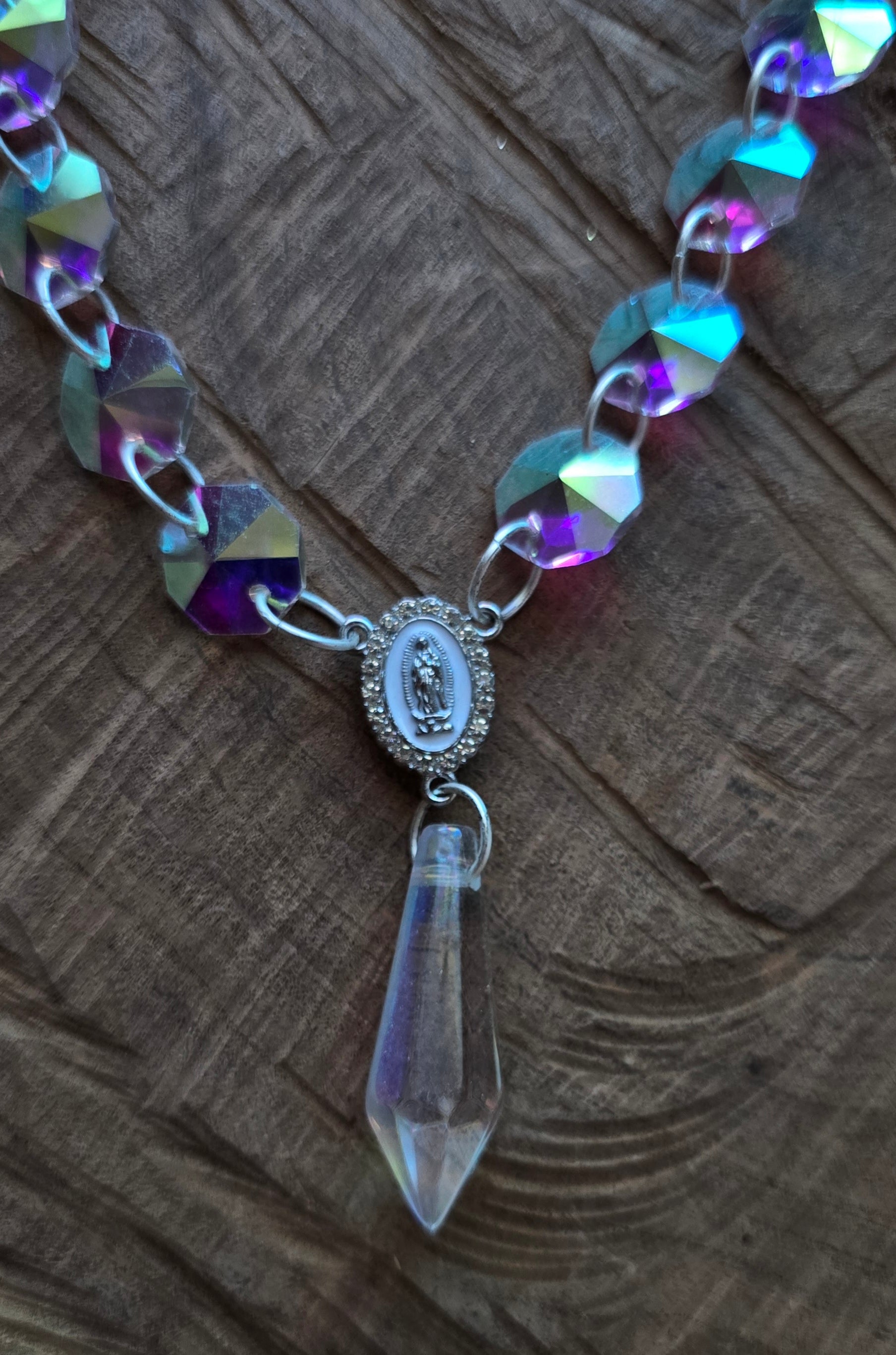 This decoration was put together by my own hands using AB crystals, silver rings, a lobster clasps to make closing and opening easier. It also has a virgin Mary surrounded by little rhinestones for extra bling bling! ✨️